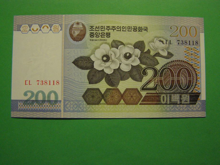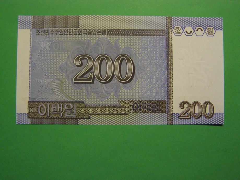 Prodam bankovec za 200 Won iz Severne Koreje (200 KPW), kot ga lahko vidite na fotografijah. Bankovec je povsem NOV - UNC kvalitete.