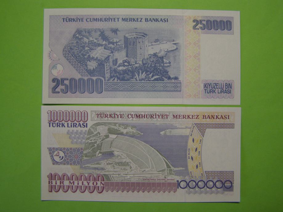 Prodam bankovca za 250000 in za 1000000 Lir iz Turčije, kot ju lahko vidite na fotografijah in sta povsem nova, UNC kvalitete.