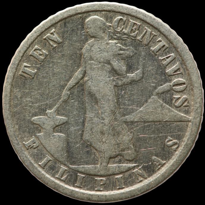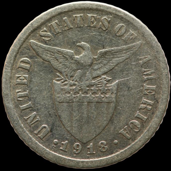 LaZooRo: Filipini 10 Centavos 1918 VF - srebro
