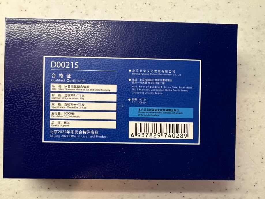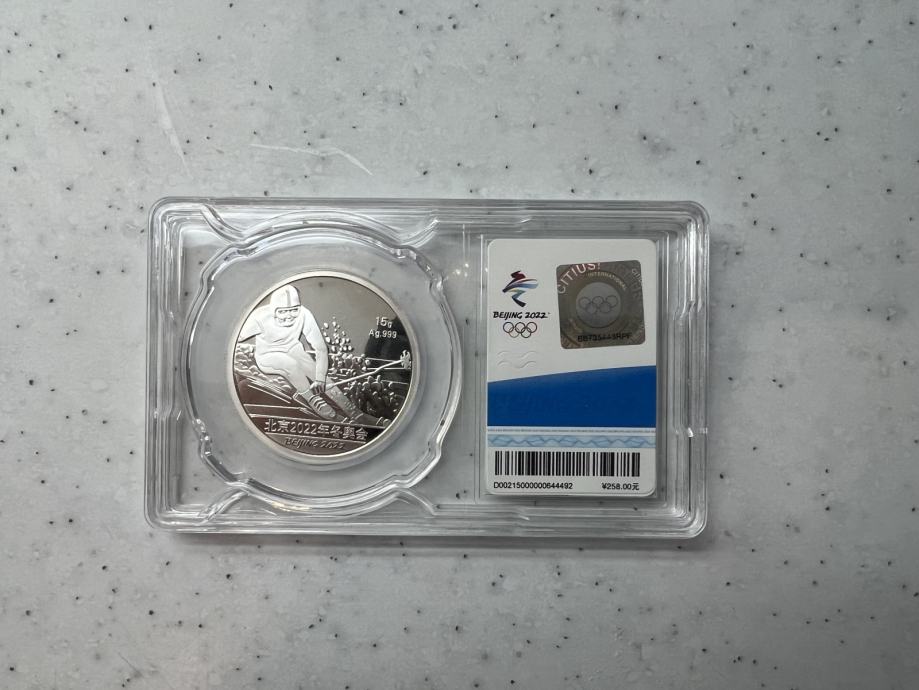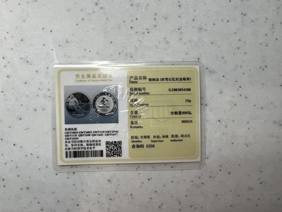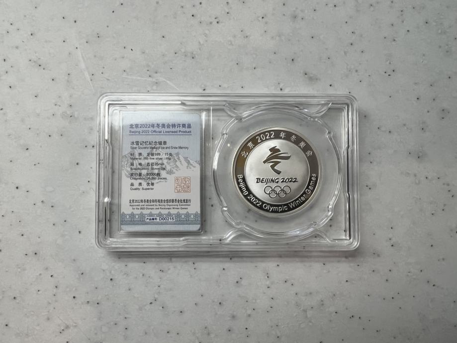 Srebrnik, izdan ob priložnosti zimskih OI v Pekingu leta 2022, teže 15g, čistine 999, v kapsuli in darilni šatulji, s certifikatom, prodam.