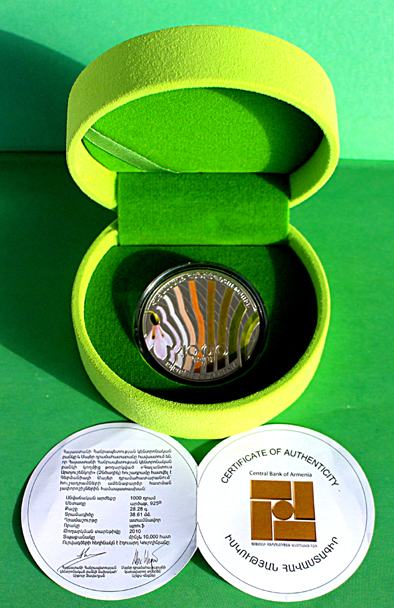 Kovanec se nahaja v plastični kapsuli, ta pa v kovinskem etuiju, oblečenem z imitacijo semiša, prijetne zelene barve. Certifikat pritrjuje svilnati trak. Ležišče kovanca ima utor za diagonalni dvig kapsule, ki ga ni nujno uporabiti, saj kapsulo lahko dobimo z nagibom etuija za 180°.