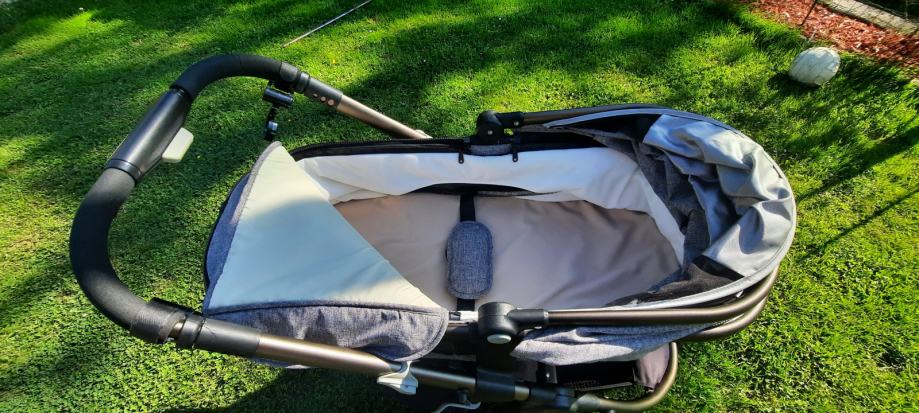 Voziček je sive barve, blago ni strgano, dodatna je podloga za poletje (hlajenje).