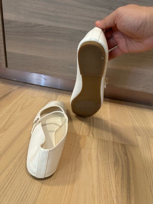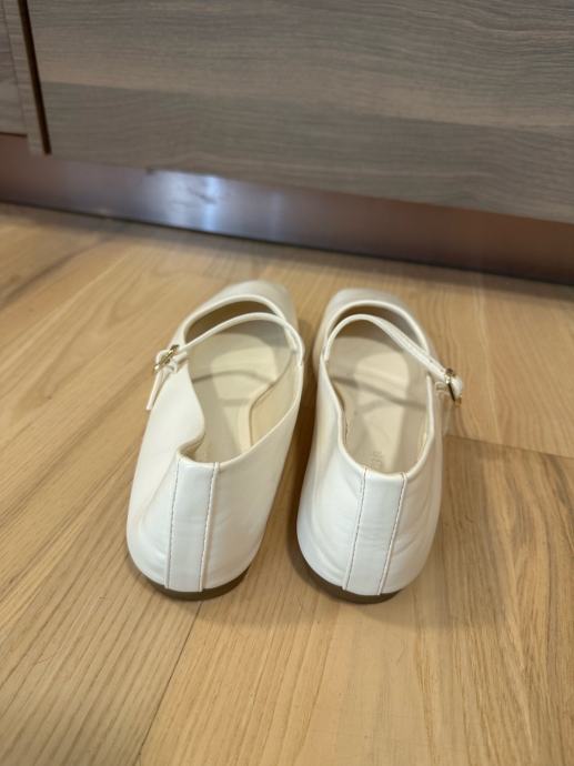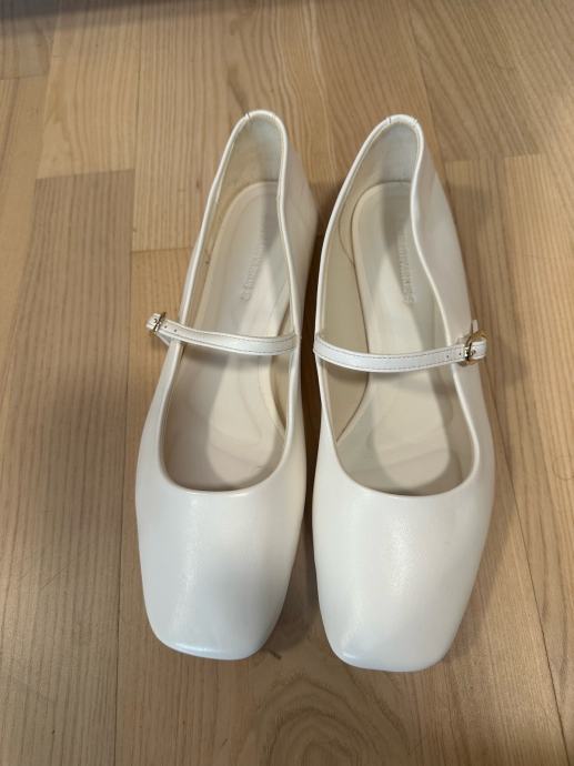 Prodajam rabljene bele balerinke znamke Stradivarius v velikosti 40. Čevlji so izdelani iz umetnega usnja in imajo eleganten dizajn z zaponko. Kljub uporabi so še vedno v dobrem stanju in primerne za vsakodnevno nošenje.