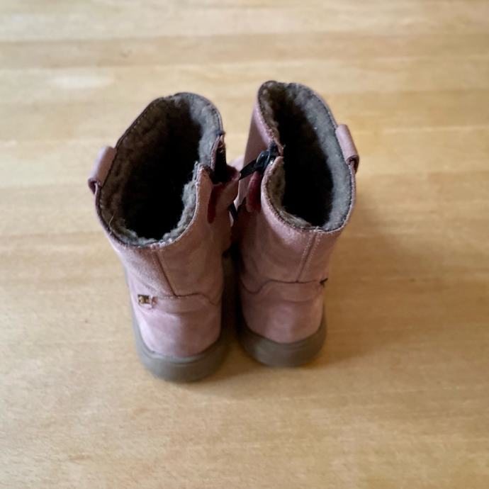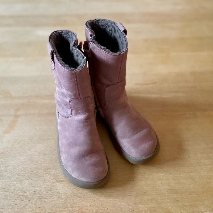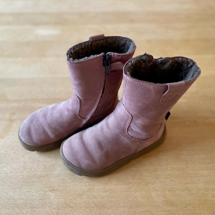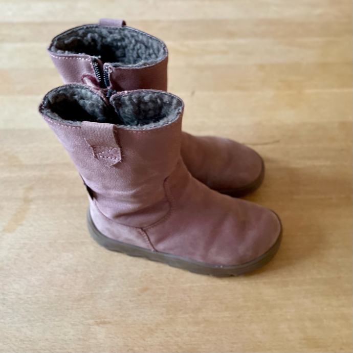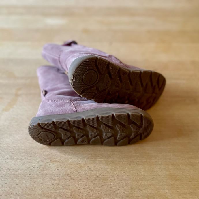 Lepo ohranjeni semiš bosonogi zimski škornji Froddo Suede TEX nežno roza barve. Podloženi z ovčjo volno in z vodoodporno membrano, ki ščiti noge pred vlago.