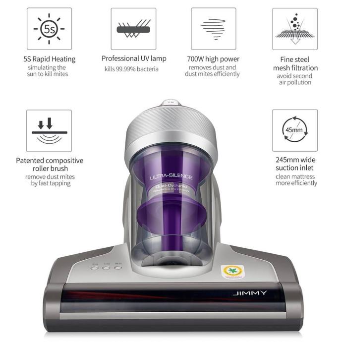 Pri odpravljanju nesnage mu je v pomoč nova generacija visokozmogljivih motorjev, tako se lahko pohvali z tišjim delovanjem, energijsko varčnostjo ter izjemno 99.9% učinkovitostjo. Novi JV35 je opremljen z 6 stopenjsko ciklonsko filtracijo, ki učinkovito odvaja prah in delce iz zraka: prva filtracija se tako opravi v sami posodi za prah, sledi filtracija skozi fino jekleno mrežo skozi katero preide v patentirano dvo-ciklonsko filtracijo, nadaljuje se nato v HEPA stopnjo in MIF filtracijo ter zaključi z zadnjo fazo pri čemer se filtracija opravi skozi fino gobico. Da je učinkovitost novega Jimmy JV35 še na višjem nivoju poskrbi patentirana 45-milimetrska široka električna valjčna ščetka zasnovana iz mehkega gumijastega traku in antistatičnih vlaken, tako je poleg čistoče poskrbljeno tudi da se vaše odeje in žimnice pri tem ne poškodujejo. Ščetka se pri svojem delovanju hitro vrti in tepta površino tako temeljito odstrani nesnago, kos pa je tudi odstranjevanju dlak in lasi brez kakršnegakoli zapletanja. Pri sami uporabi so vam na voljo trije načini uporabe in sicer: UV delovanje skupaj z sesanjem, teptanje in sesanje ali UV delovanje, teptanje ter sesanje.