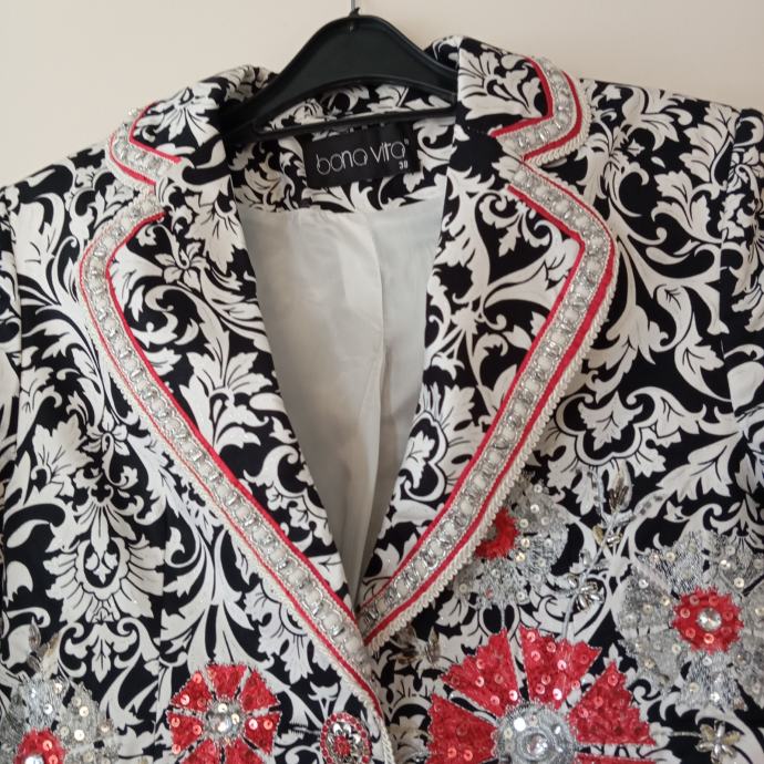 višji cenovni razred, nov, črno berl z rdečo vezenino in bleščicami, izredno eleganten, bombažen podložen, ni raztegljiv, od ene pazduhe do druge meri 44cm, dolžina je 55cm, od enega ramenskega šiva do drugega meri 39cm, ne menjam, ptt ni9 vključena v ceno