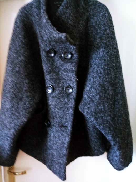 črna jakna z večjim ovratnikom, št. 40 11 eur, siva melirana jakna, št 42 14 eur in siv bomber s kapuco Australian l'Alpina št 48 14 eur.