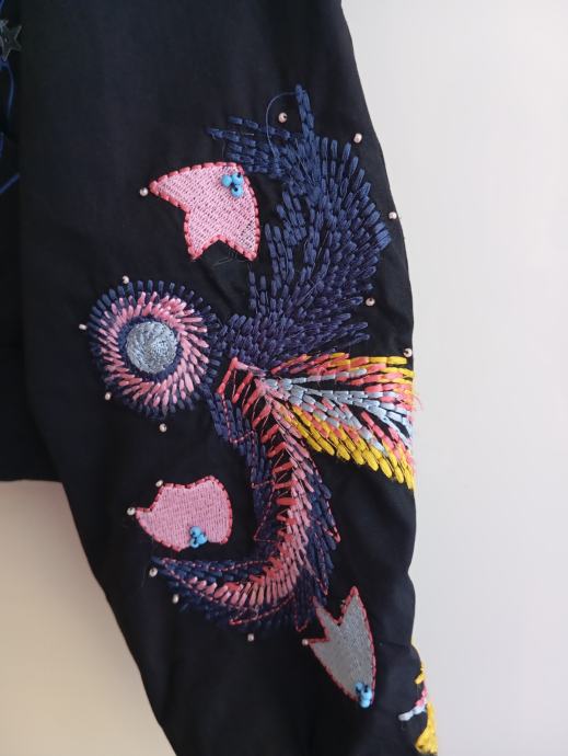 nova, bombažen, podložen, ni raztegljiv, od ene pazduhe do druge meri cc 50cm, (krojen je v obliki metulja), dolžina je 50cm, spodaj ima patent, ki meri 37 do cca 42cm, orig. velikost je 38, primeren je tudi za vel. 40, ne menjam, ptt ni vključena v ceno