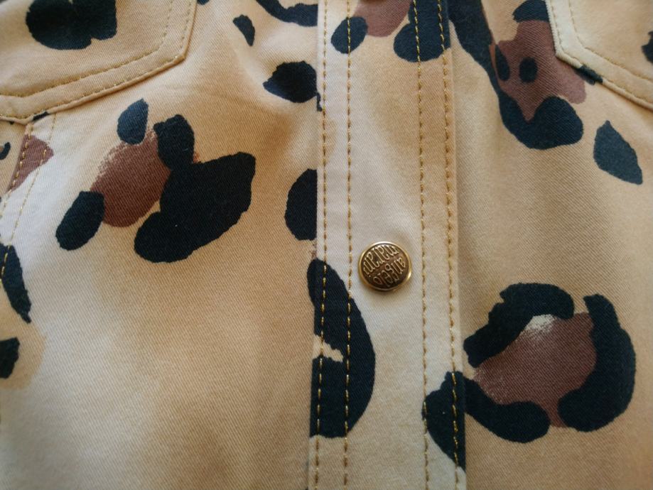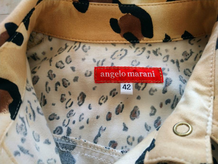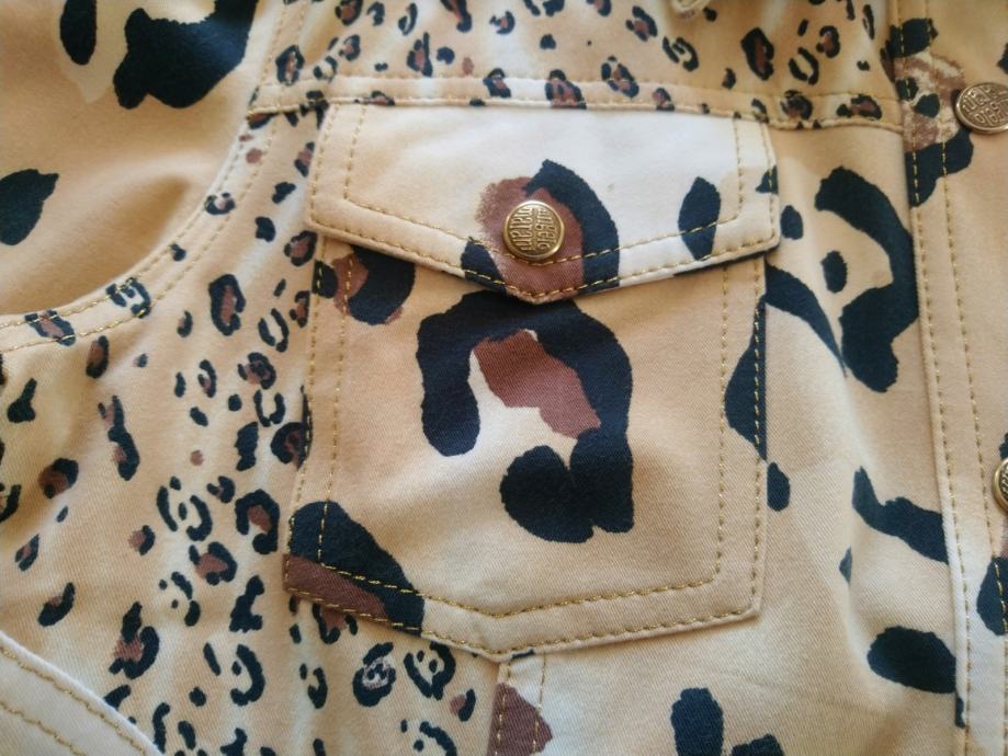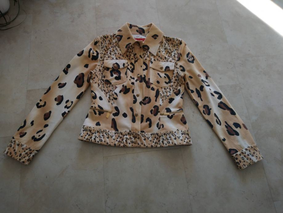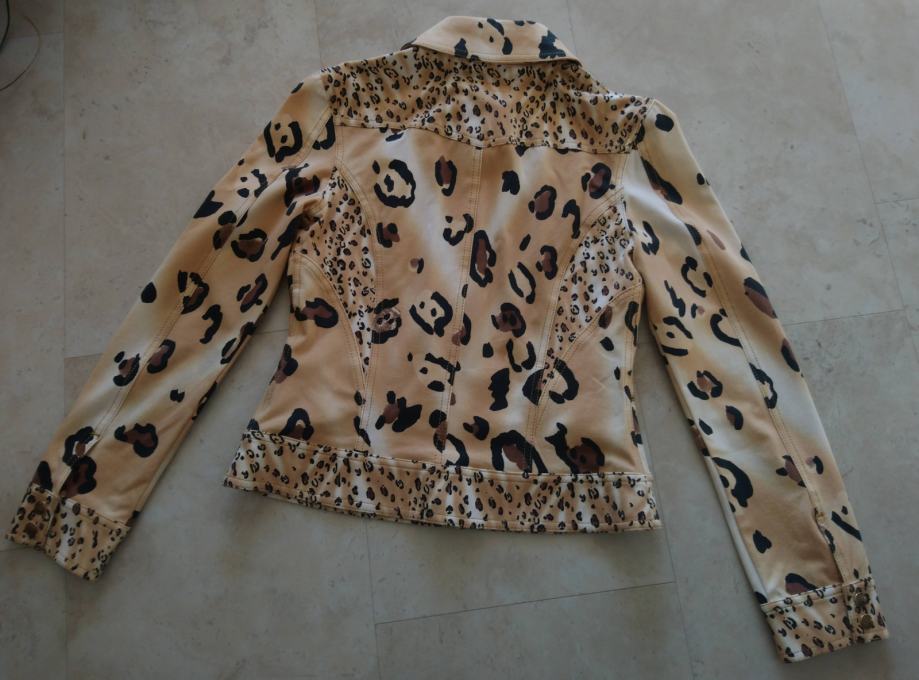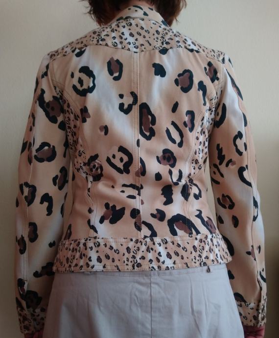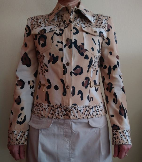 Krajša ženska jakna v tigrastem vzorcu, znamke angelo marani. Jakna ni podložena, ima štiri žepe, dva prsna na gumbek in dva običajna na zadrgo. Zapira se na gumbe - pristikači. Šivana je z nitjo v zlati barvi. Velikost 36 (italijanska 42), dolžina jakne 54 cm, širina čez prsa 46 cm, širina v pasu 41 cm, širina na spodnjem robu 47 cm, dolžina rokava 62 cm. 92% bombaž in 8% elastana.