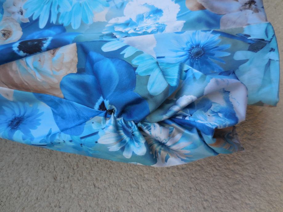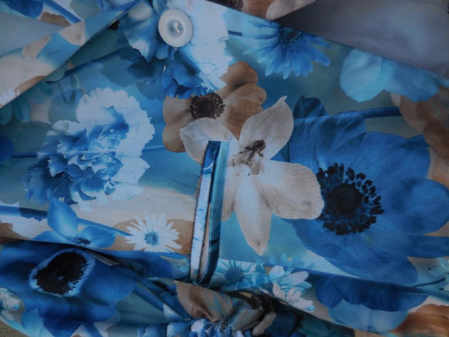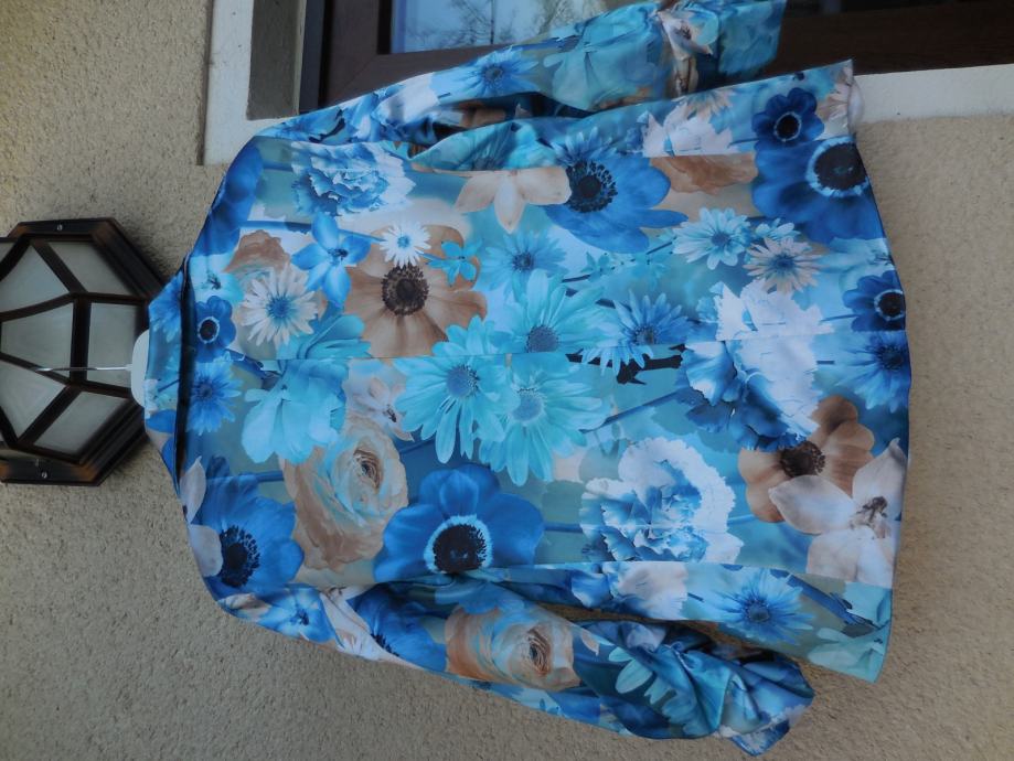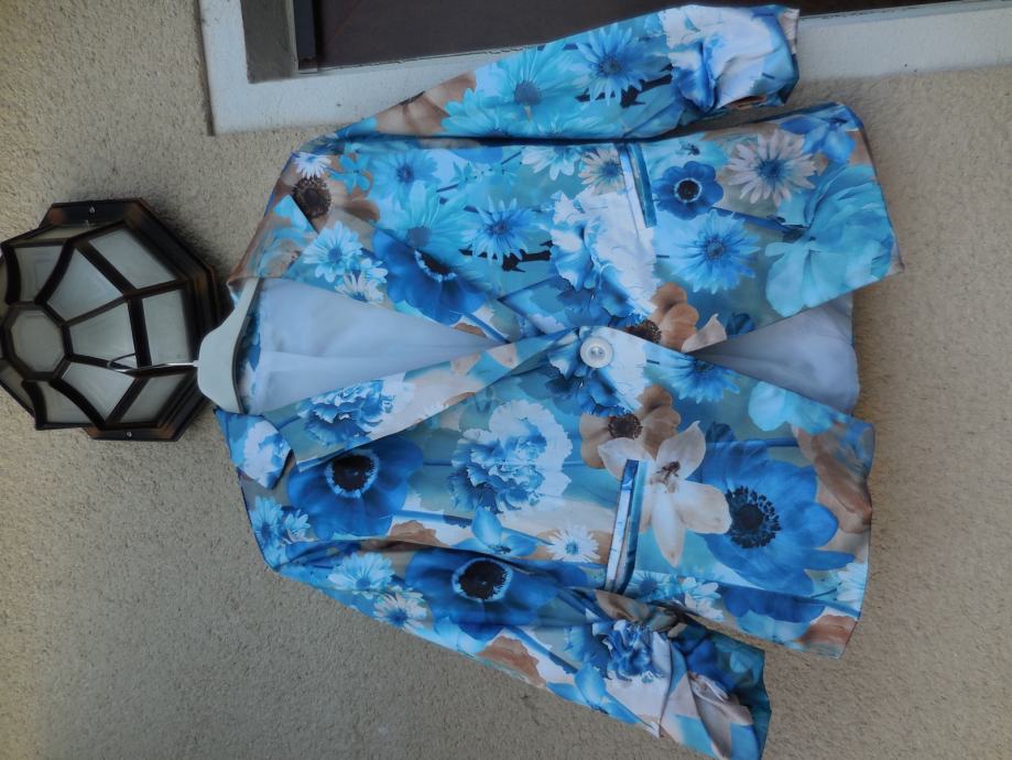 Nikoli nošena kratka spomladanska cvetlična jakna v videzu satena. Je podložena in ni raztegljiva, zapenja se spredaj na gumb, na sprednji strani ima 2 žepa, rokavi so spodaj nekoliko nabrani.