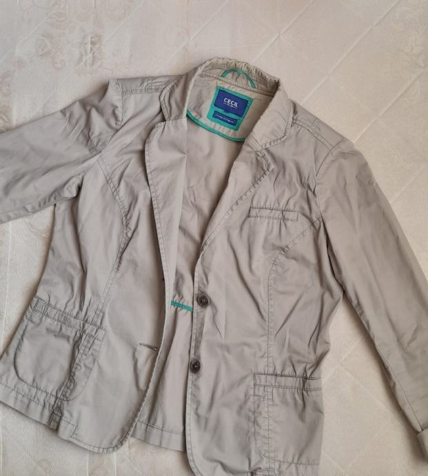 Odlicno ohranjen blejzer, suknjic, blagovne znamke Cecil, st. S / M (na njej pise XS, kar ni realno), sestava 98% bombaz in 2% elastan. Mere: sir.ramen 41cm, dolz.hrbtnega dela 61cm, dolz.rokava od pazduhe 46cm, sir.hrbtnega dela od pod pazduhe do pod pazduhe 51cm. Ni sprana ali zbledela barva.