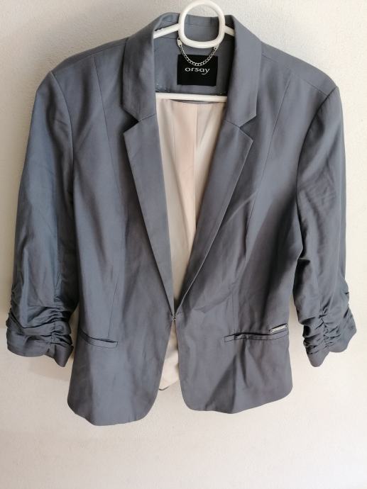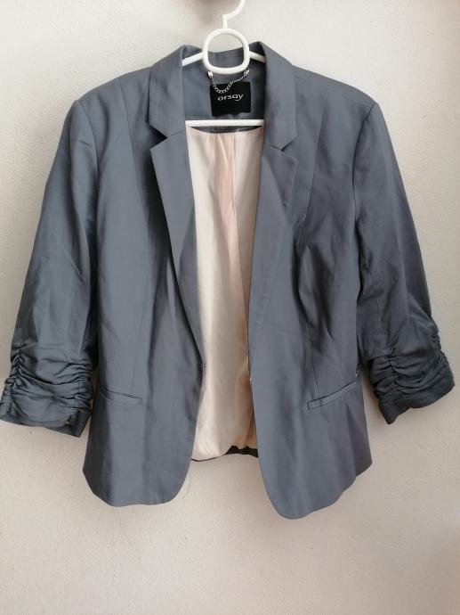 Suknjič / blazer je v sivi barvi z bež podlogo. Ima 3/4 rokave, na komolcu nabrane. Zapne se 1x spredaj.