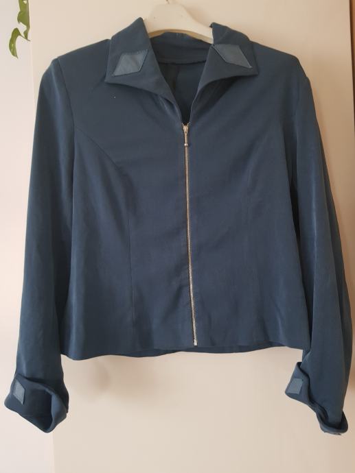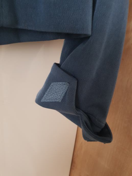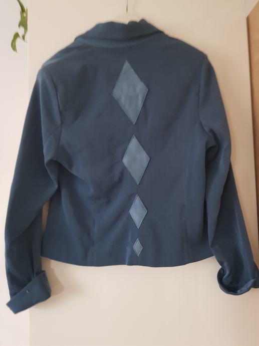 Unikatna, delana po naročilu, sivo modre barve, z dodatki pravega usnja na hrbtni strani in rokavih, podložena, delno raztegljiva
