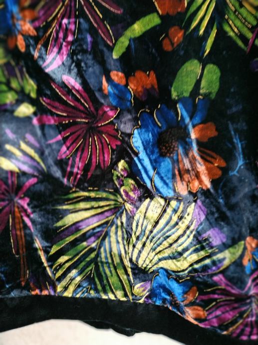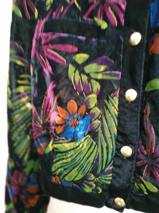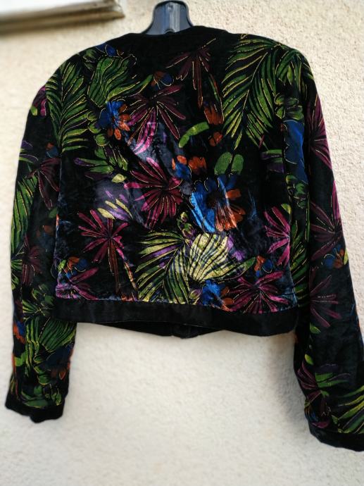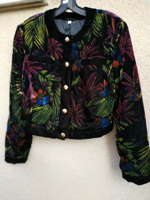 Jakna je bila pred časom samo kupljena in nikoli nošena. Ima videz gladkega žameta in cvetlični potisk., je podložena zelo lahka in prijetna na otip, ni raztegljiva in je zelo topla. Na zgornji sprednji strani ima dva žepa.