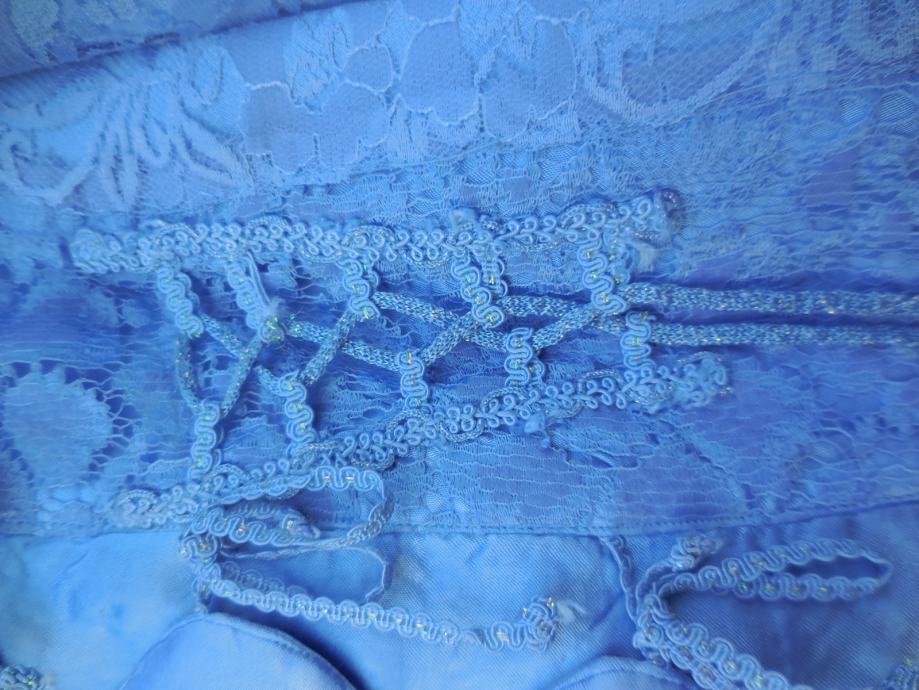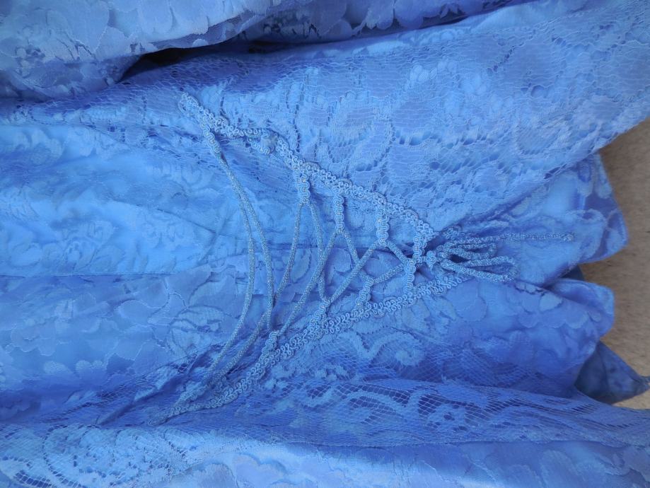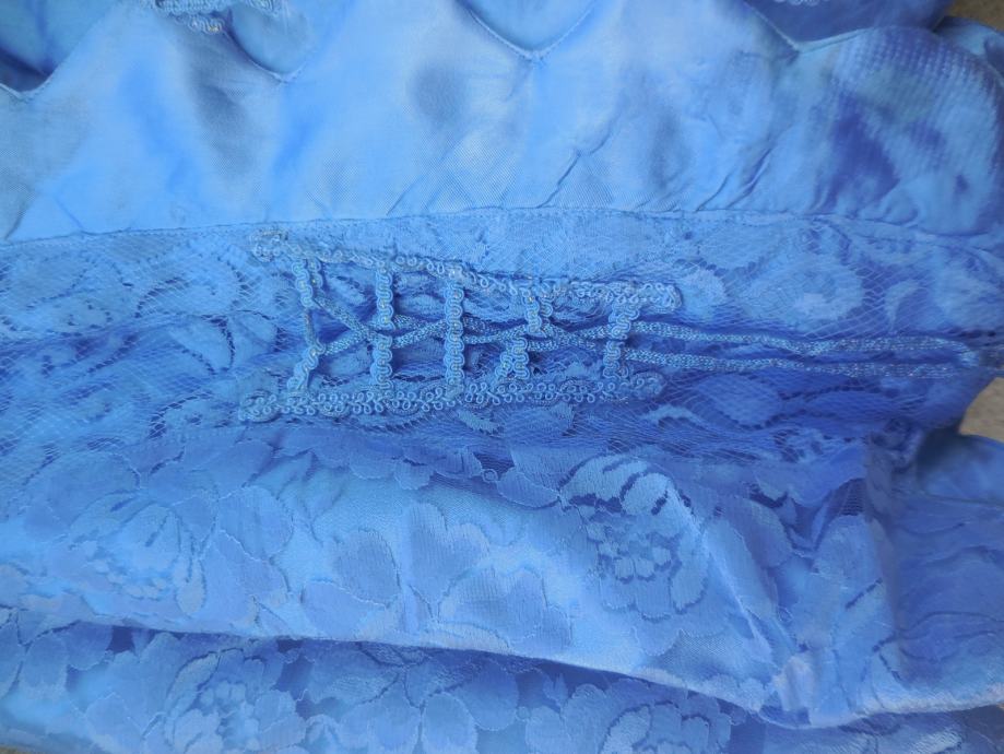 zelo lepo ohranjena vintage svetlo modra čipkasta jakna. Je zelo kompaktna, zapenja se s trakovi, ki so delno svetleči, je podložena in ni raztegljiva.