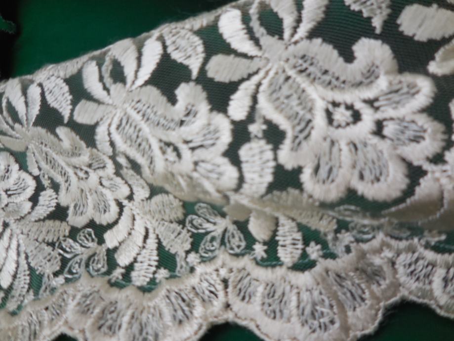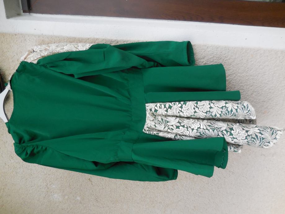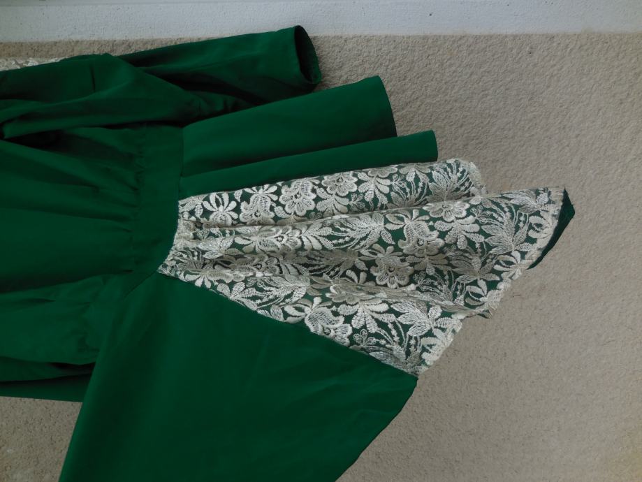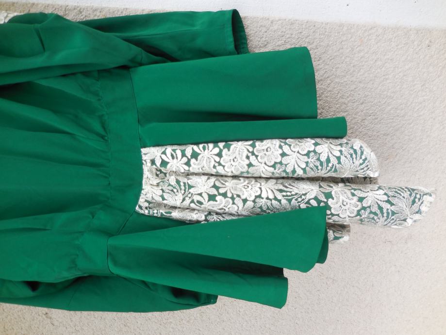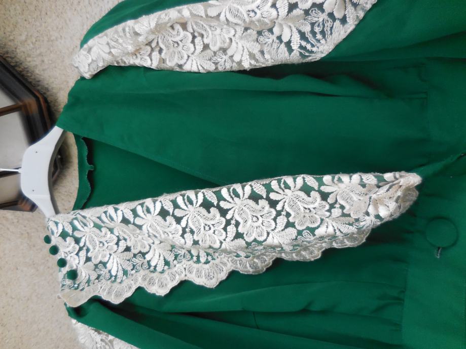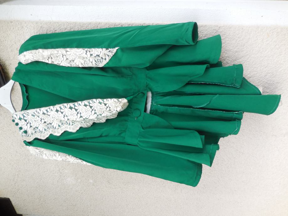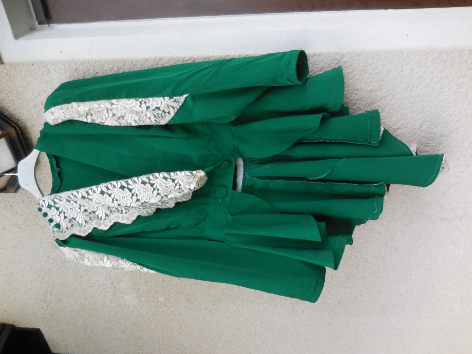 Unikatna zelena jakna s bež čipko, delana po naročilu. Ni podložena in ni raztegljiva. Čipka je na sprednji in zadnji strani ter po dolžini rokava.