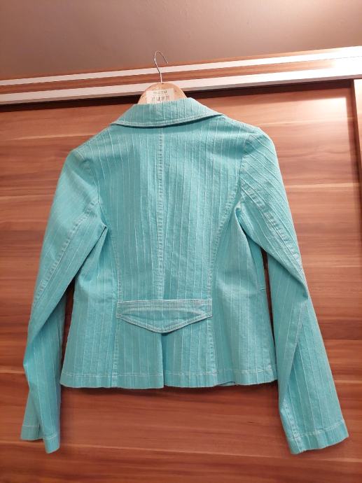 Prodajam rabljen ženski suknjič velikosti M v modri barvi z nežnimi vertikalnimi črtami. Suknjič ima lepo broško v obliki metulja in dva svetla gumba na sprednji strani. Odlično ohranjen z lepimi detajli, primeren za različne priložnosti.Bombaž/elastan.
