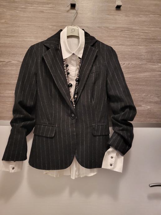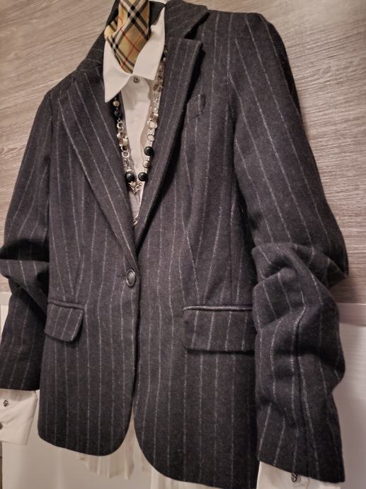 Prodam želo dobro krojen ženski ,toplejši blazer.Kroj je zelo ženstven.Barva je antracitno siva ,z diskretnimi svetlejšimi črtami.Velikost 36.