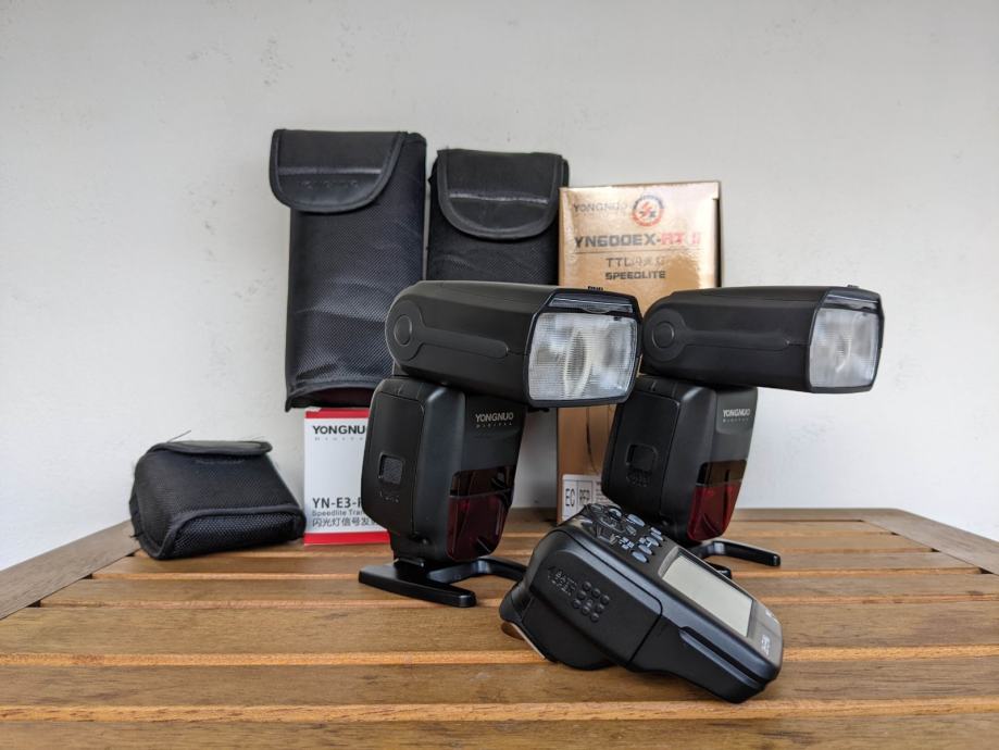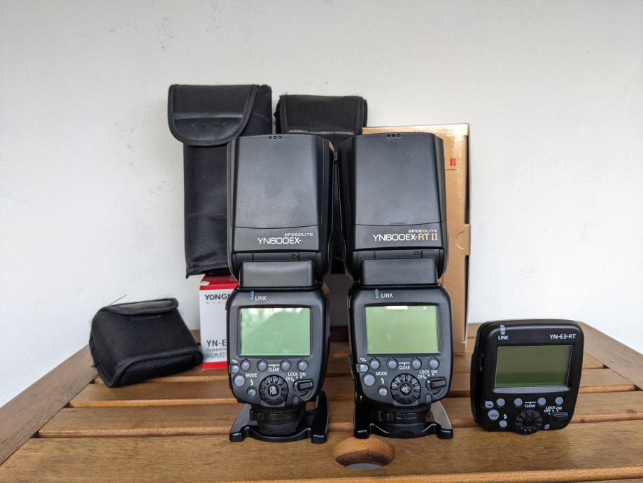 Sistem je za Canon. Prodajam zaradi menjave sistema bliskavic. Možna je menjava za Godox / Quadralite sistem bliskavic in prožilca. Bliskavice so identične Canonovim Speedlight 600 RT II za tretjino cene.