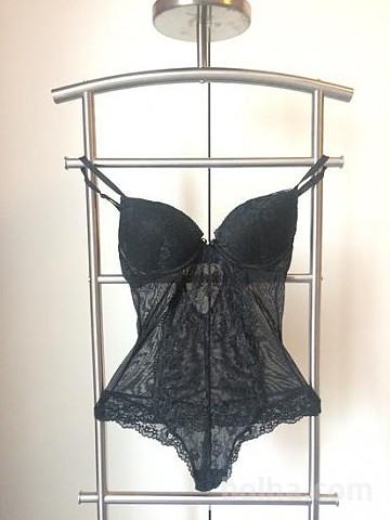 Kot nov body kupljen v H&M. Oblečen nekajkrat, pod bodijem sem vedno nosila spodnji del perila. Zgornji del bodija je nedrček spodnji pa tangice. Modrc ima malo push up. Velikosti S, modrc je velikosti A. Zelo lep body ampak mi je žal modrc premajhen. Kupljen za 20€.