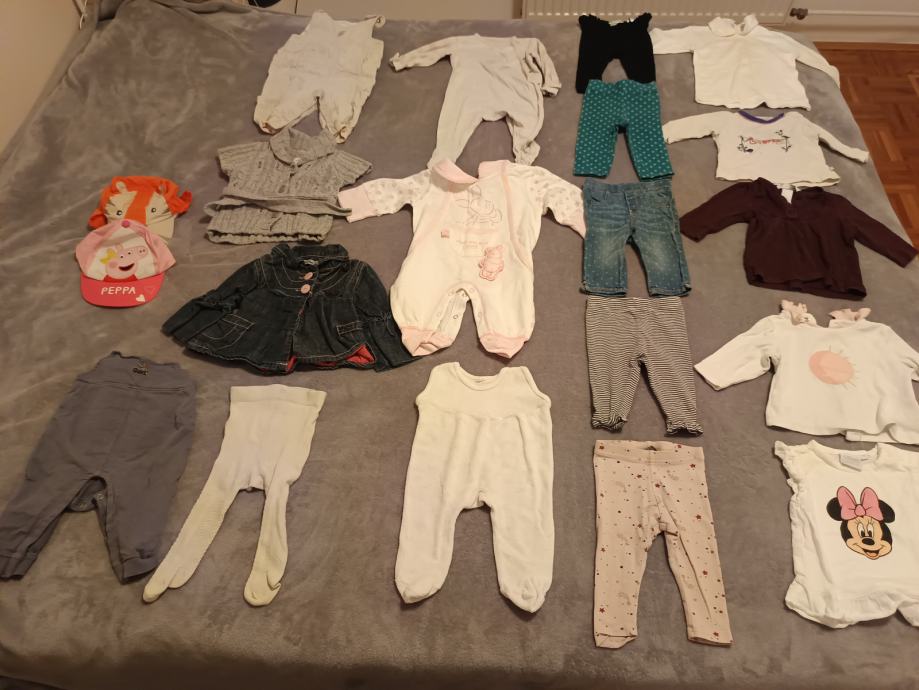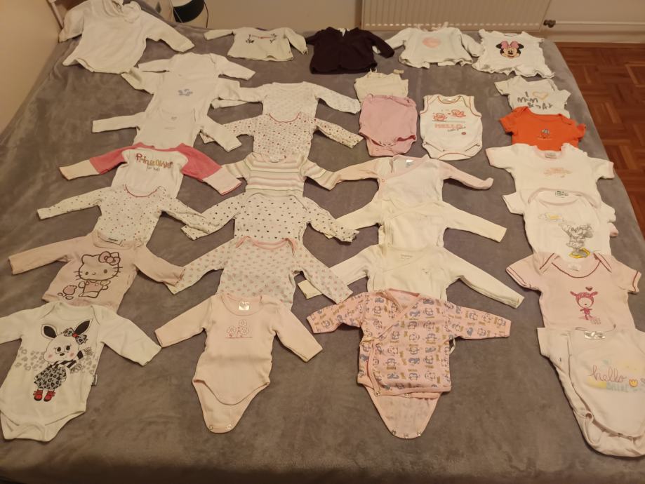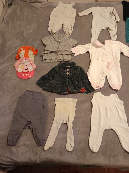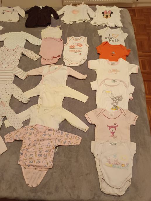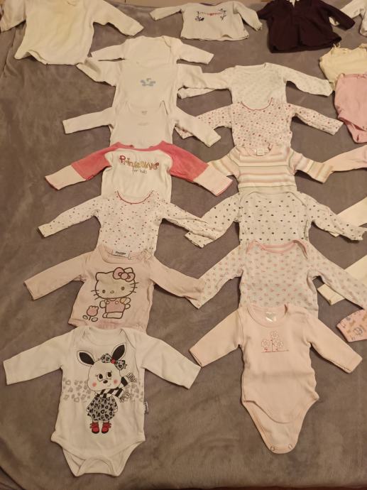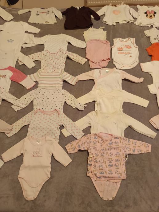 Prodam oblačila za novorojenčico, primerno za punčko. Vsa oblačila so na slikah + podarim še dva bodija, ki nista na fotografijah. Paket vsebuje 18x bodi z dolgimi rokavi,7x bodi s kratkimi rokavi, 3x bodi brez rokavov, 4x majica dolg rokav, 1x majica kratek rokav, 5x dolge hlačke, 2x pižamica z dolgimi rokavi, 1x pižamica brez rokavov, 1x zimske žabice, 1x jopica, 1x jaknica, 2x pajacek (hlace pajacek), 2x kapica s šildom. Prodam vse skupaj. Večinoma gre za številke 50-62, kakšna številka je tudi 68 in 74.