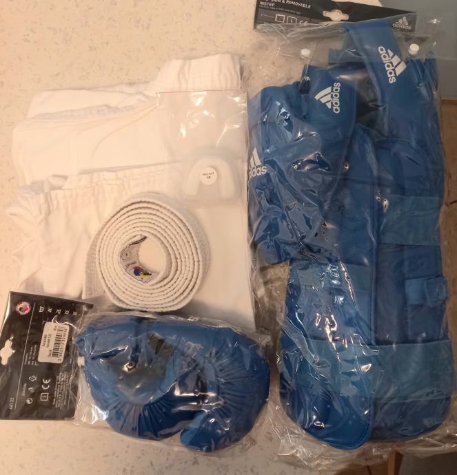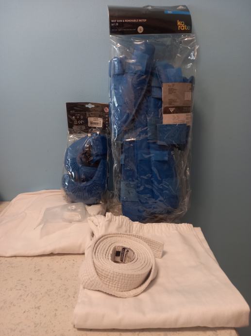 Prodam praktično nov kimono velikosti 4/170-WKF aproved (oblečen 1x za polaganje pasu), ščitnike za noge, velikost L in roke velikost M (uporabljeni nekajkrat na treningih) ter popolnoma nov ščitnik za zboe v orig. škatlici.
