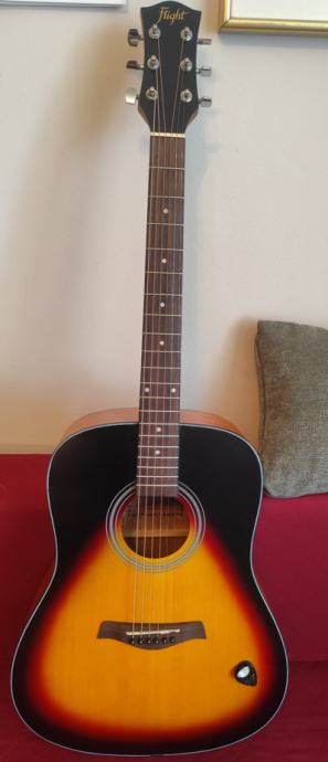 Prodam skoraj novo in zelo malo igrano akustično kitaro FLIGHT D-175 SB skupaj s prenosno torbo, trzalicami, nosilcem za trzalice, oglaševalcem in kapodastrom.