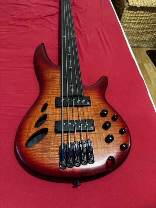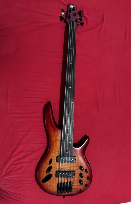 Prodajam 5-strunski fretless bas Ibanez SRD905F v barvi Brown Topaz Burst Low Gloss. Kupljen leta 2024, praktično kot nov (odigran zelo malo, brez prask ali poškodb).