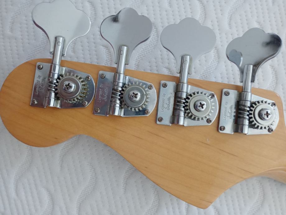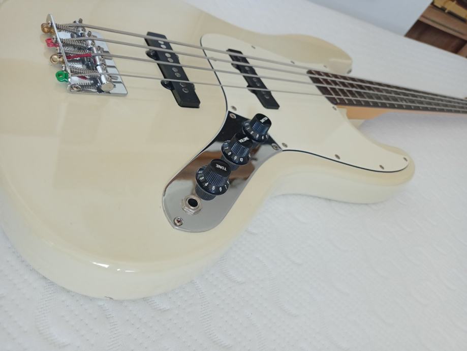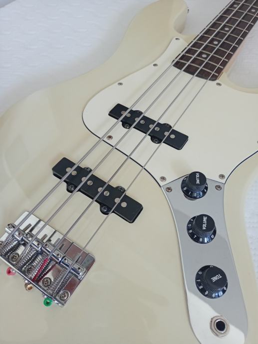 Prodaja se za svoja leta odlično ohranjena in delujoča električna kitara Fender Squier Jazz Bass Made in Korea, letnik 1989. Minimalne sledi uporabe. Zraven spada stojalo, pas, torba in kabel.