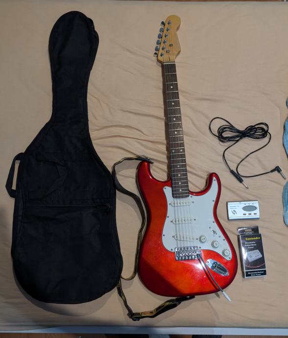 Prodam električno kitaro, ki je v izvrstnem stanju in brez poškodb. Kitara ima tudi svojo vrečo in oglaševalec. Priložim tudi par 5 trzalic in kabel (3m) za ojačevalec. Zraven podarim še ojačevalec, ker sicer dela ampak ni v odličnem stanju in se mi ne zdi fer, da zanj računam.