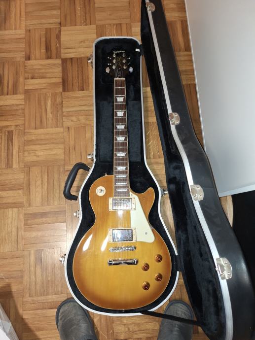 Prodam, odlično ohranjeno, kot novo električno kitaro Epiphone Les Paul s kovčkom. Kitara ima še nalepko na magnetu, igrana skoraj samo doma, brez praske. Ima 50's vrat in je izredno lepe honeyburst barve, fotke mi žal niso uspele. Kitara je tudi zvokovno odlična, lahko se jo pri meni primerja z resničnim Gibson Les Paulom. Prodajam samo zato, ker mi vrat ne paše. Kitara je tudi prijetno lahka, ima strap locke, pas in kovček. Cena 550 eur, možne menjave za kak lažji stratocaster ali kaj podobnega. Lahko tudi za isto kitaro s 60's vratom, epiphone 335, manjši lampaš (marshall studio classic ali vintage...)