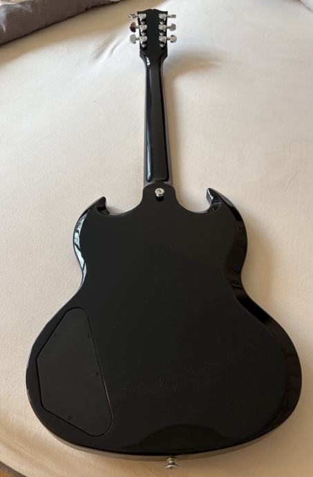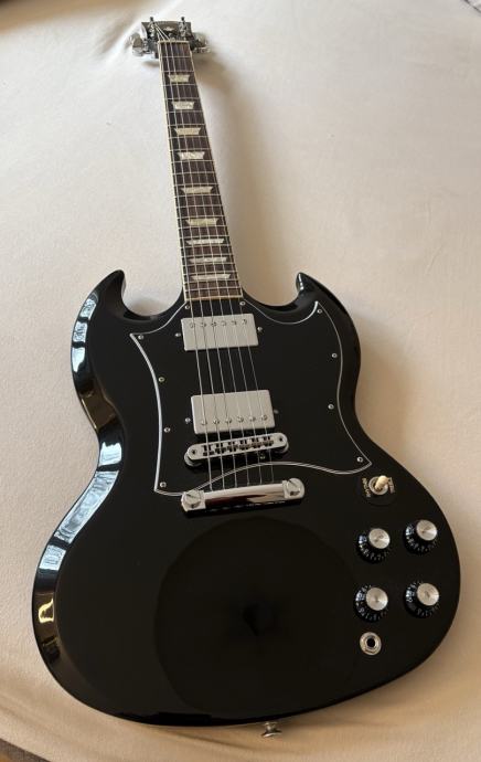 Prodam Gibson SG Standard Ebony (črna barva). Kitara je kot nova. Dobil sem jo v menjavi, ko sem prodajal prejšnjo kitaro. Je zelo igrabilna, nastavljena je bila pri Šinku, trenutno ima debelino strun 10-54.