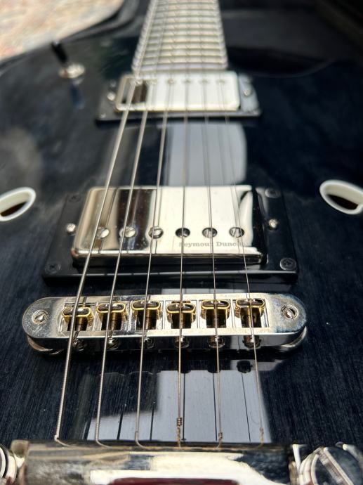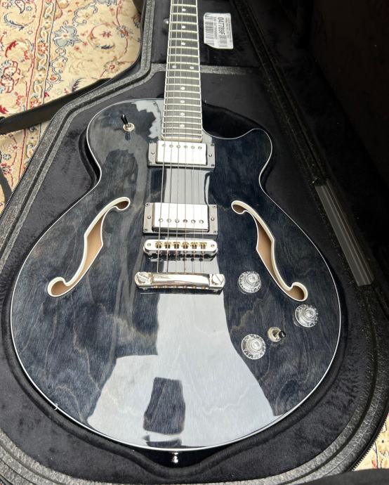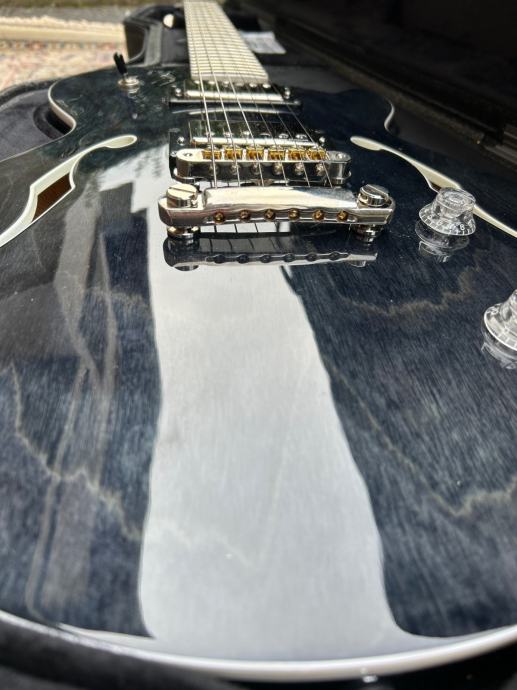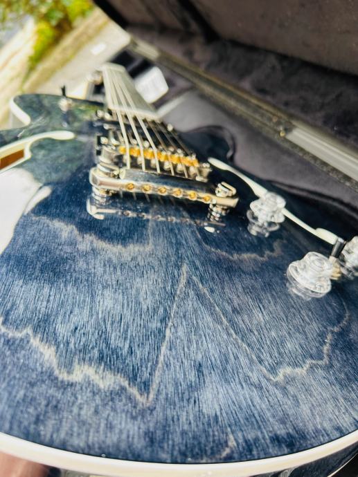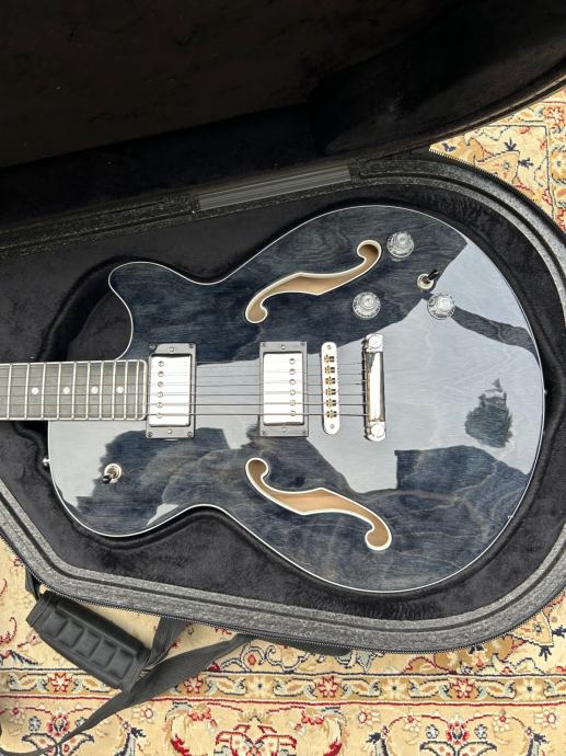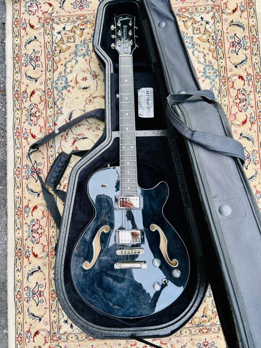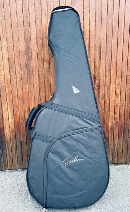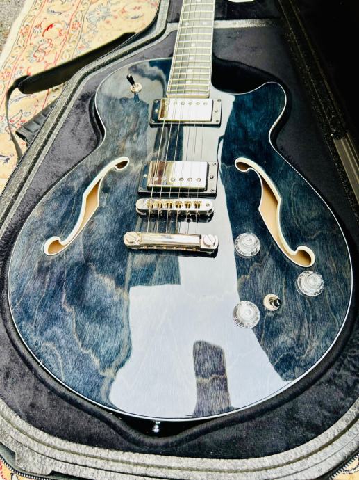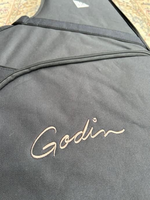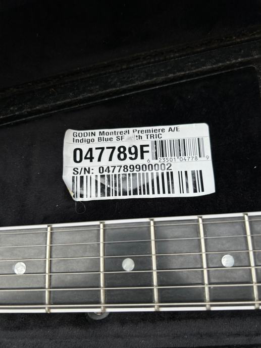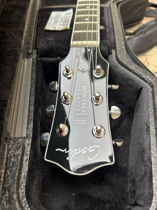 Brezhibna in inovativna kitara GODIN Montreal Premiere A/E, narejena iz kanadske divje češnje, prvi letnik 2019, opremljena s Seymour Duncan magneti, opremljena hkrati z LR Baggs piezzo akustičnim pick-upom, dve kitari v eni A/E (acoustic/electric), v čudovitem transparentnem indigo finišu. Komplet vključuje Godinov originalni TRIC case, vse original, brezhibno in čudovito zveneče. Ubiralka iz mahagonija, 12-inch radius, sustain neverjeten. Ima dva izhoda, preklop med električno in akustično kitaro možen med samim igranjem. 22. prečk. Vrhunski kos.