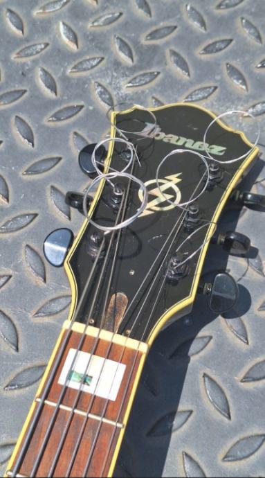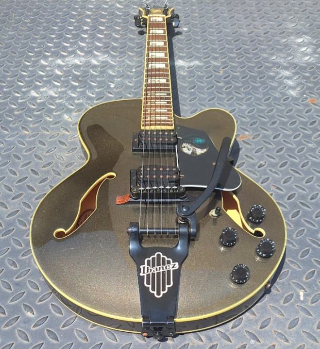 Polakustična kitara Ibanez AFS77T z Bigsbyjem za jazz, pop, blues, hardrock oziroma vsako zvrst, ki rabi definiran zvok. Lahko je elektrificirana ali izštekana (na suho). Brez kakšnih večjih znakov obrabe. V trgovini je ta kitara 600 evrov.