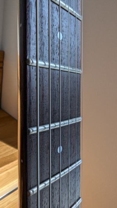 V zadnjih letih je malo igrana, zato jo tudi prodajam, nekako mi Wizard vrat ne ustreza več. V bridge poziciji je bil zamenjan magnet, trenutno je notri Seymour Duncan Distortion (SH-6, trembucker verzija), pošljem pa s kitaro tudi izvirni DiMarzio IBZ magnet. Trenutno so na kitari 10-46 Ernie Ball strune, v D-standard uglasitvi. Kitara pride v originalnem trdem kovčku (manjša razpoka na dnu). Zraven so vsi imbusi za tremolo in zadnji pokrov, ki ga sicer ni na slikah.