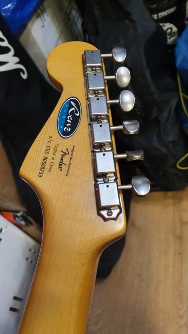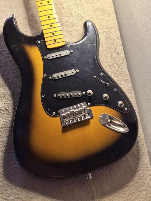 Na kitari so original magneti in elektronika, na belem pickguardu, s porumenelimi zaščitami magnetov in gumbi za potenciometre, ter stikalo.