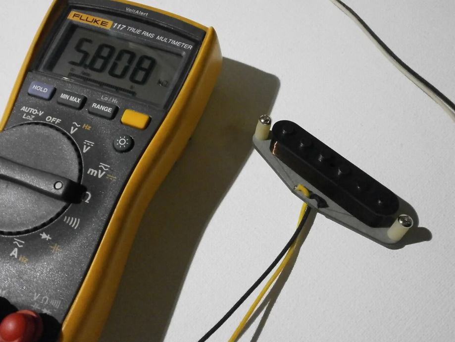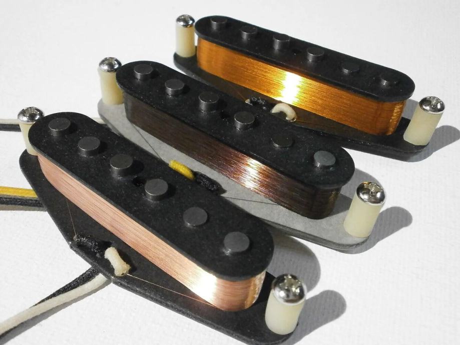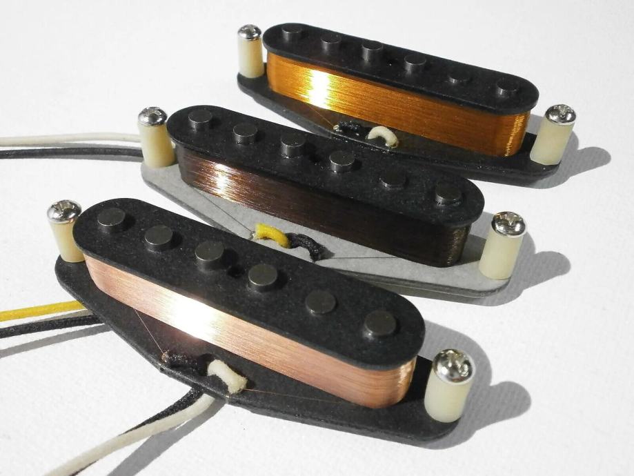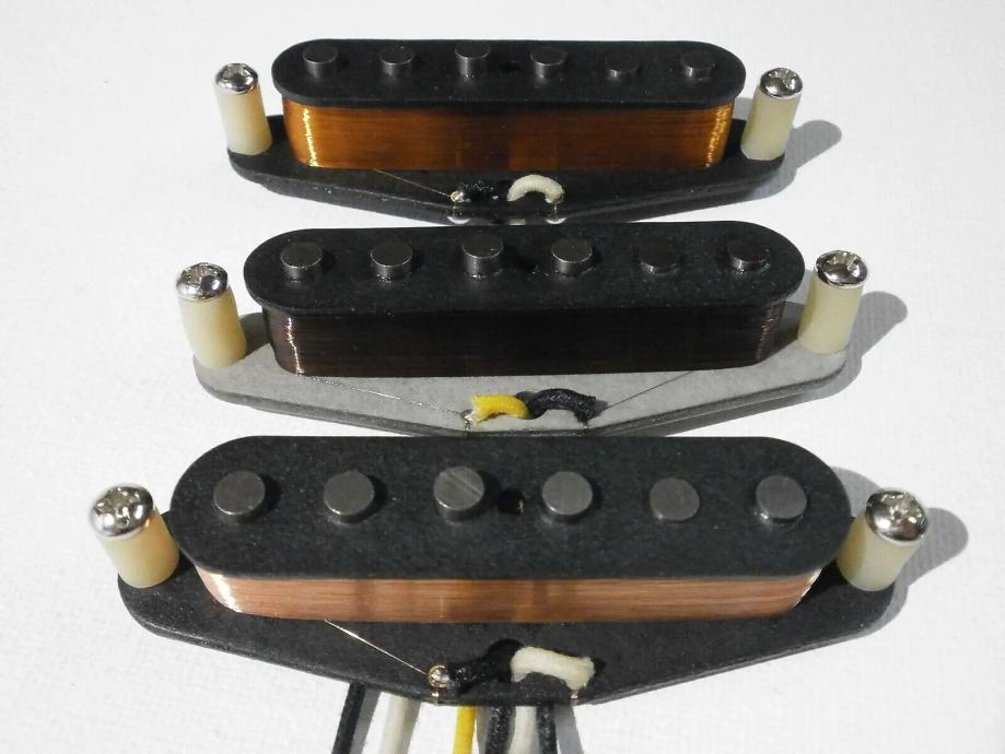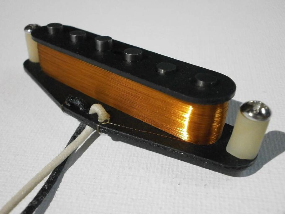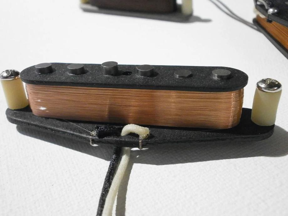 Middle pickup is Fender CS 69 replica - 5.8 kOhm with vintage correct AWG42 PLAIN ENAMEL - grey bottom bobbin, - R.W.R.P. for hum canceling - classic clean and transparent Strat tones.LACQUER POTTED.