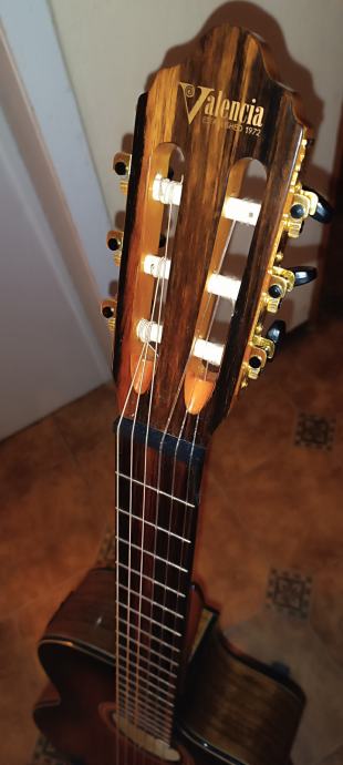 Valencia z dolgoletno bogato tradicijo že od davnega 1972L, kitara je vrhunsko zveneča, v original tovarniški embalaži, nikoli igrana, zelo atraktivnega videza, eksotičnega lesa (oreh, mahagonija, Ebenovina...). Narejen dodaten setup v vrednosti 150EU, znižana akcija, impregnacija, poliranje prečk, nove strune Savarez, in še mnogo tega, v rangu z kitarami ki so vredne več kot 1000EU, ima Lead osvetljene gumbe ter osvetljen štimer. Resnemu kupcu podarim dodatno kupljeno novo zelo kvalitetno torbo, možna menjava za kakšen glasbeni kos opreme, lahko tudi iz računalništva SSD 2TB M2, USB ključ 1TB, TV 4k 55˝, prenosni računalnik...