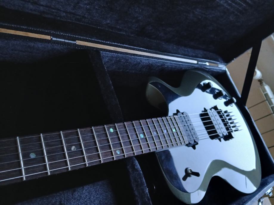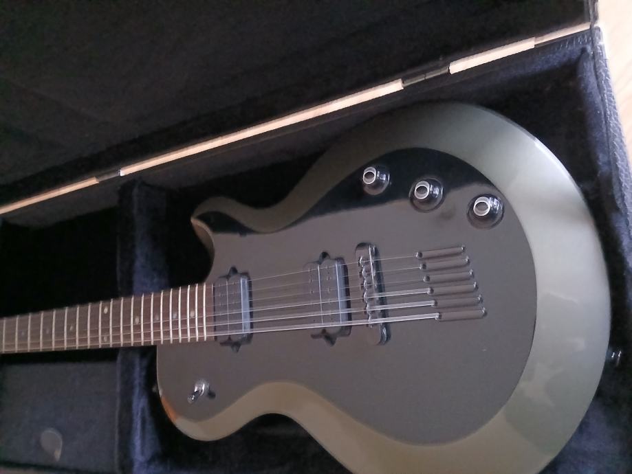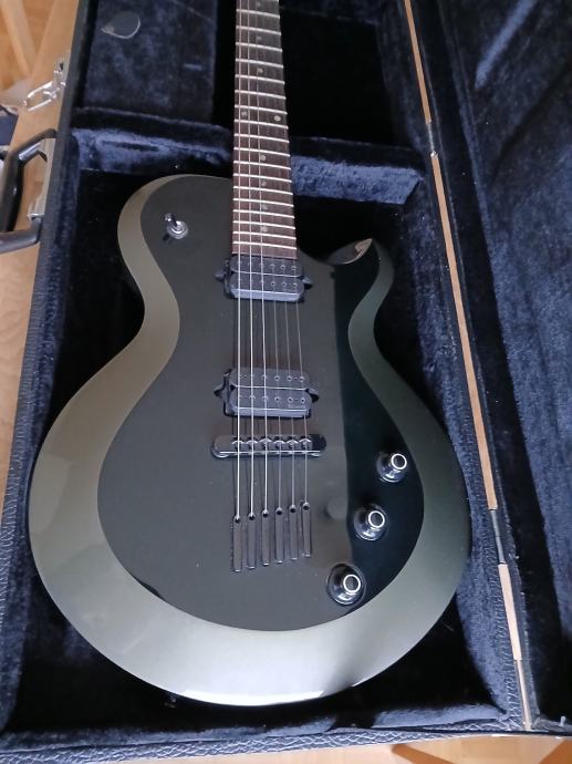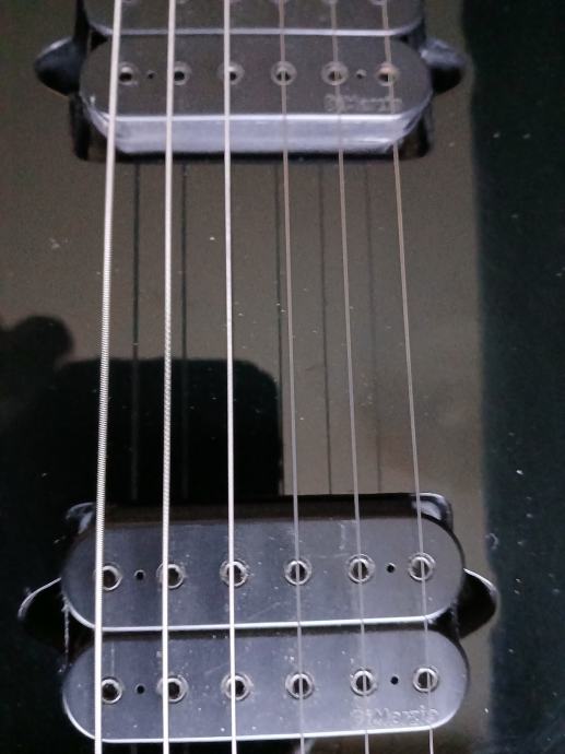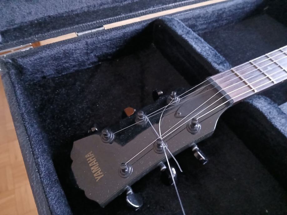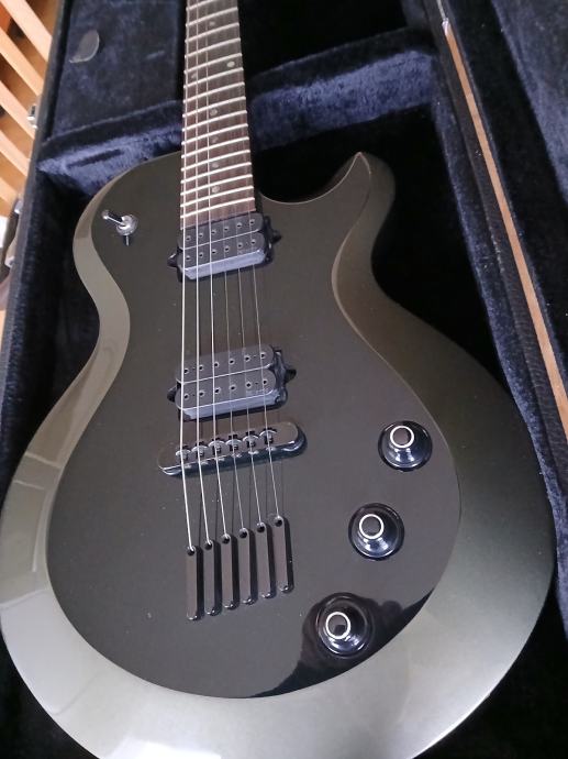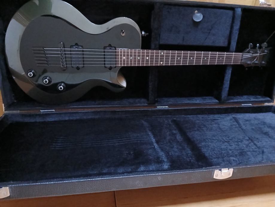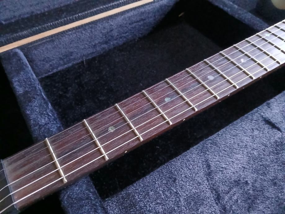 mahogany body, a set-neck construction mahogany neck, rosewood fretboard, 24-3/4" scale length, dot inlays, 13-3/4" fretboard radius, 22 frets, two custom DiMarzio direct-mount humbuckers, a 3-way switch, individual volume controls with a master tone, a Yamaha original AES bridge, Grover tuners, and black hardware