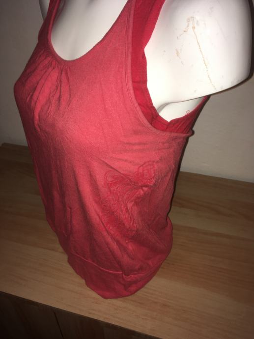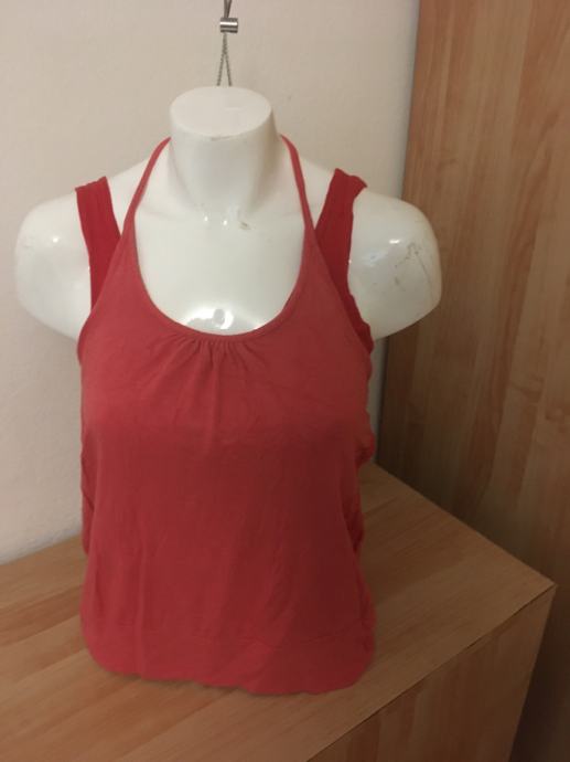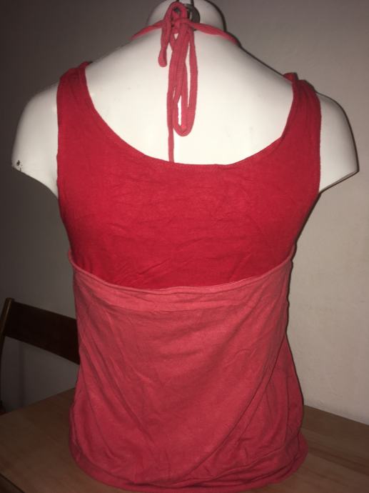 Dve v eni, spodaj je top rdeče barve, preko je majica z vezanjem okoli vratu v koralni barvi.
