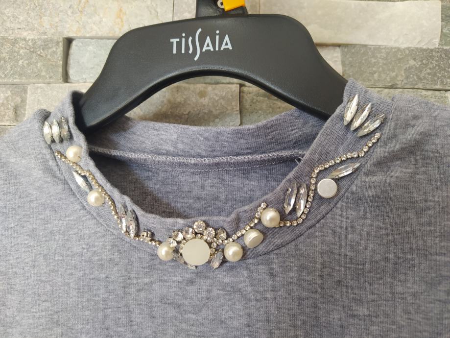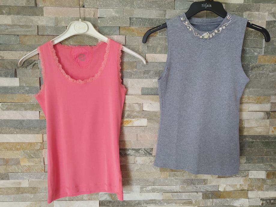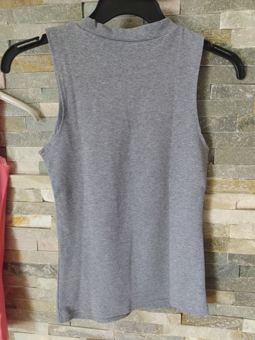 Majica brez rokavov s perlicami ob izrezu, v svetlo sivi barvi. Velikost S/M, dolžina 53 cm, širina čez prsi 33 cm. Material, 95 % bombaž, 5 % elastana.