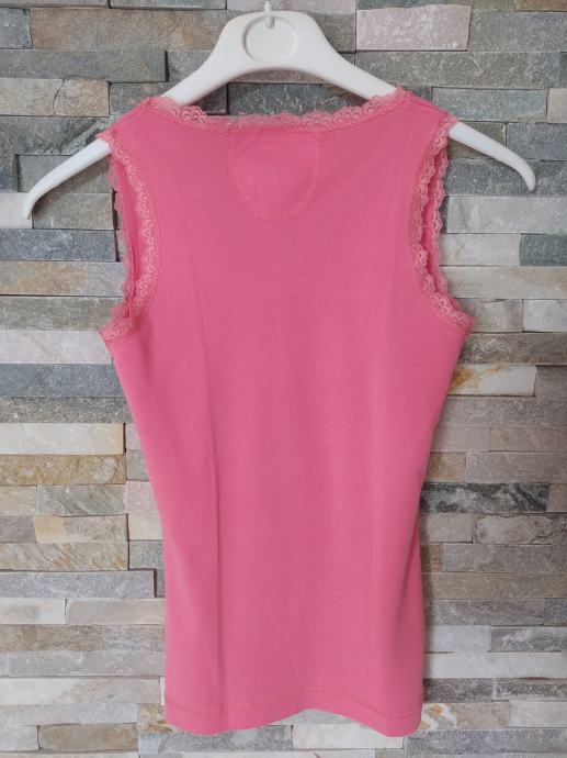 Majica brez rokavov s čipko v koralno roza barvi, znamke Montego. Velikost S, dolžina 56 cm, širina čez prsi 35 cm. Material, 100 % bombaž.