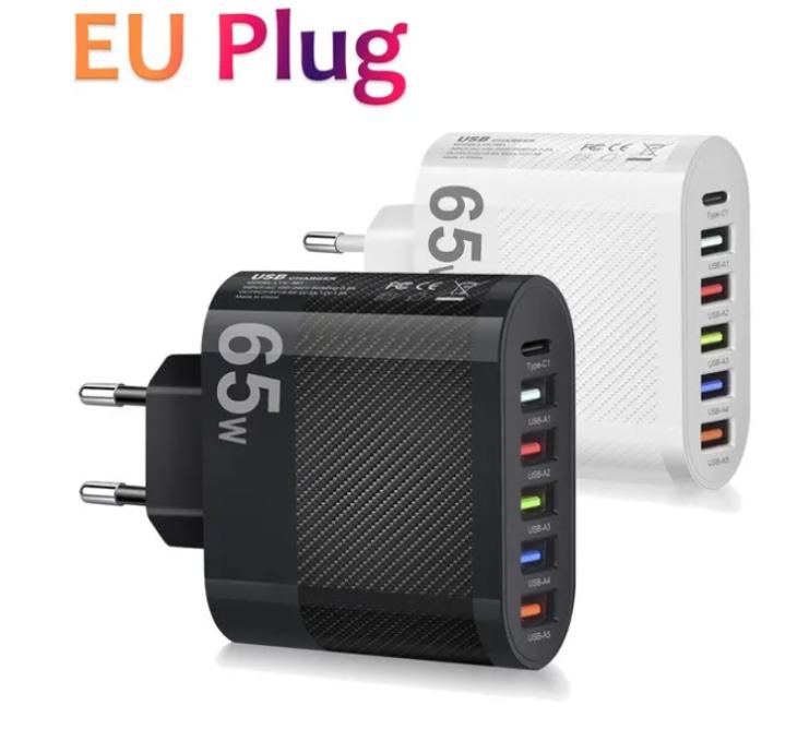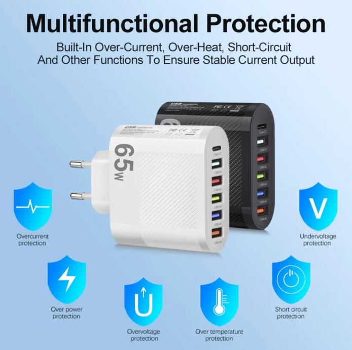 Skupaj: Izhodna moč: [vseh 5 * USB-A + 1 USB-C] = skupno 65 W;