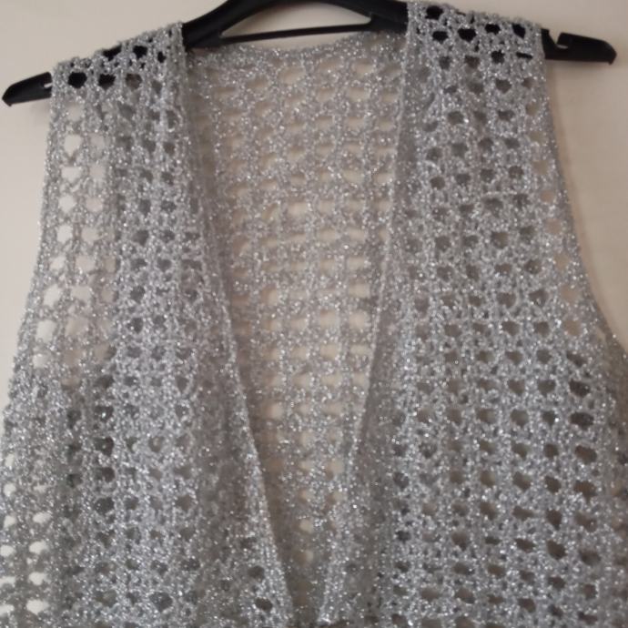 Nošen samo 1x, ročno pleten, raztegljiv, od ene pazduhe do durge meri 48cm, dolžina je 70cm, ne menjam, ptt ni vključena v ceno