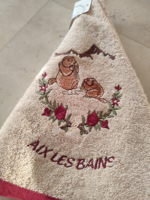 2. Nova okrogla brisača za roke v bež barvi, z bordo obrobo in gorskim motivom svizca. Na sredini ima zanko, da se brisačo lahko obesi. Premer 75 cm. Zelo kvaliteten bombaž - 100 %. Cena je 7 € +ptt.