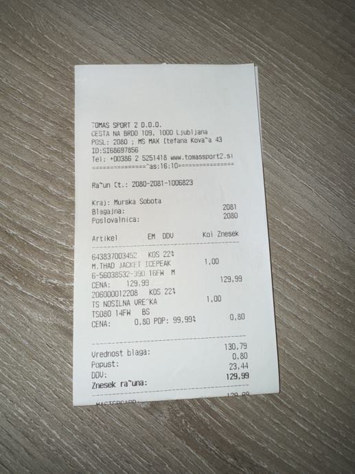 Je lepo ohranjena in primerna za hladne dni. Kupljena je bila v Tomas Sportu (Sport Vision), imam tudi račun.