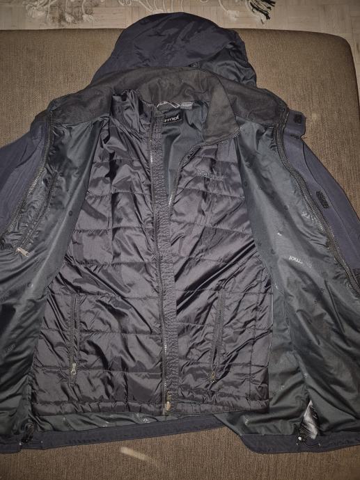 Zimska jakna vrhunske znamke Marmot 3 v 1. Lahko se nosi sestavljena zunanji vodoodbojni in proti vetrni sloj s kapuco ter notranja puhovka. Lahko pa se nosi loceno puhovka ali zunanji sloj. Puhovka se z zadrgo vpne v zunanji sloj, v rokavih pa se spne v zapestju. Stara cca 2 leti, nosena skoraj nic. Barva črna. Velikost M.