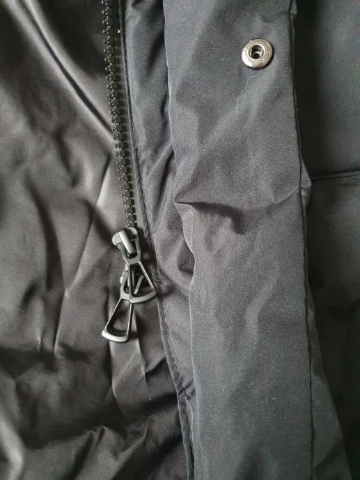 Fantovska daljša črna bunda z dvojno zadrgo in možnostjo zapenjanja z gumbi. Dva zunanja žepa, nesnemljiva kapuca, patentirani rokavi z notranjo podlogo za boljšo zaščito.