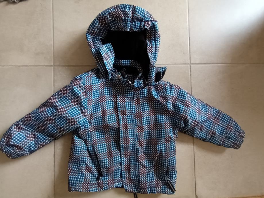 Prodam bundo s karo modrim vzorcem, s kapuco, na zadrgo in ježke. Patent na koncu rokavov, patent okoli pasu. Znamka Lupilu, velikost 98/104.