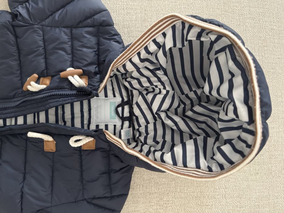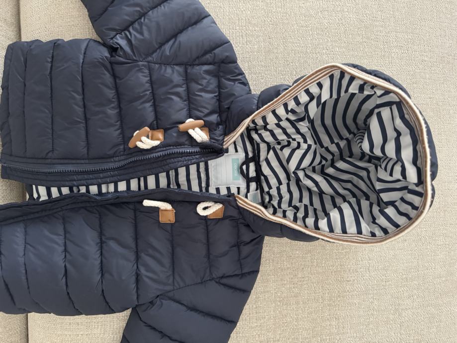 Prodam lepo ohranjeno, malo nošeno prehodno otroško jakno Okaidi v temno modri bravi, v velikosti št. 74, 9-12 mesecev. Jakna je bila kupljena spomladi 2025.